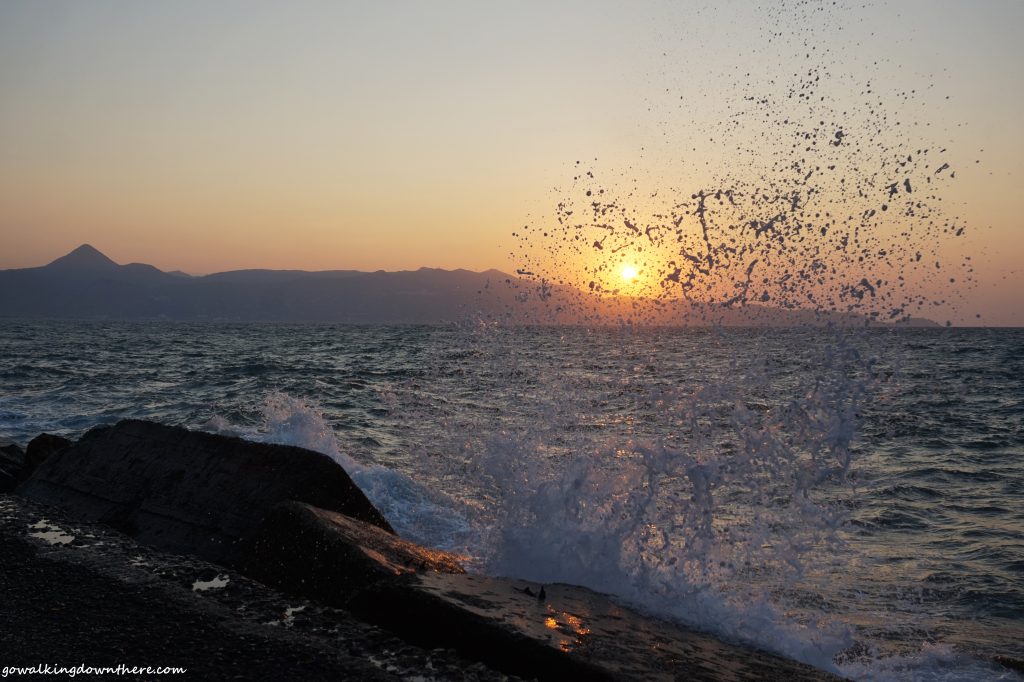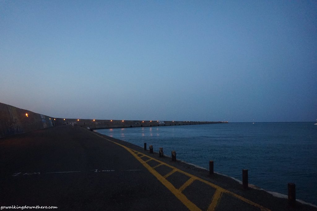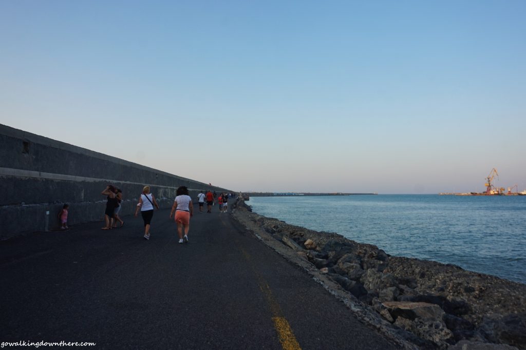 Vue sur la ville depuis un long parcours sur la digue de 1km. Il en reste autant à faire. Feu d'artifice de vagues