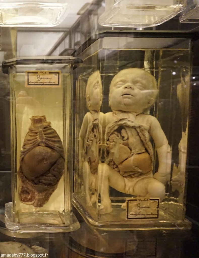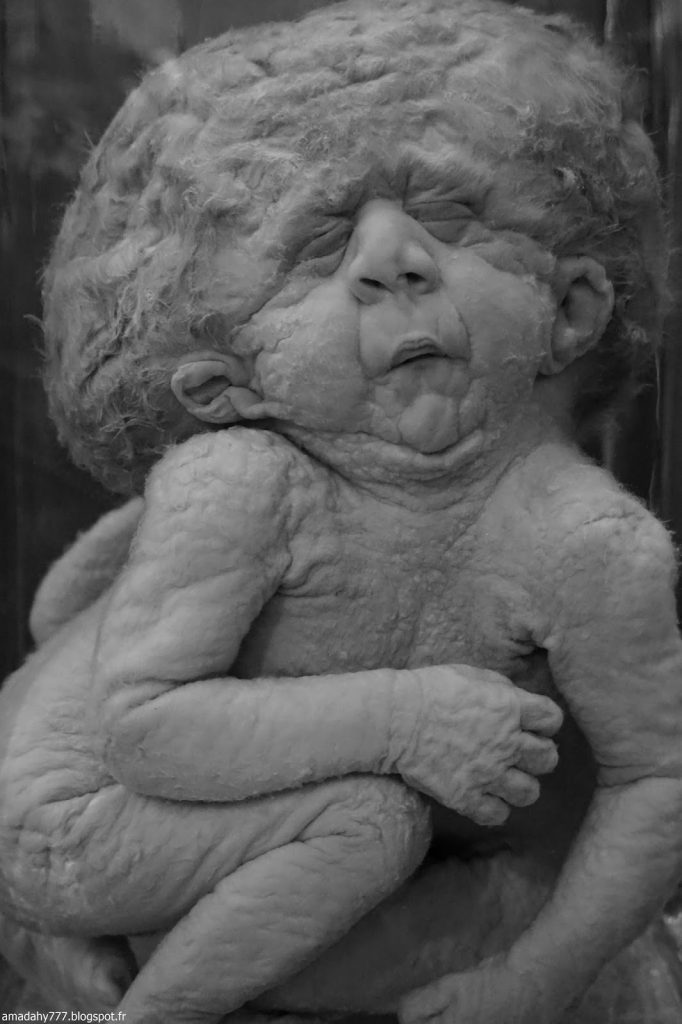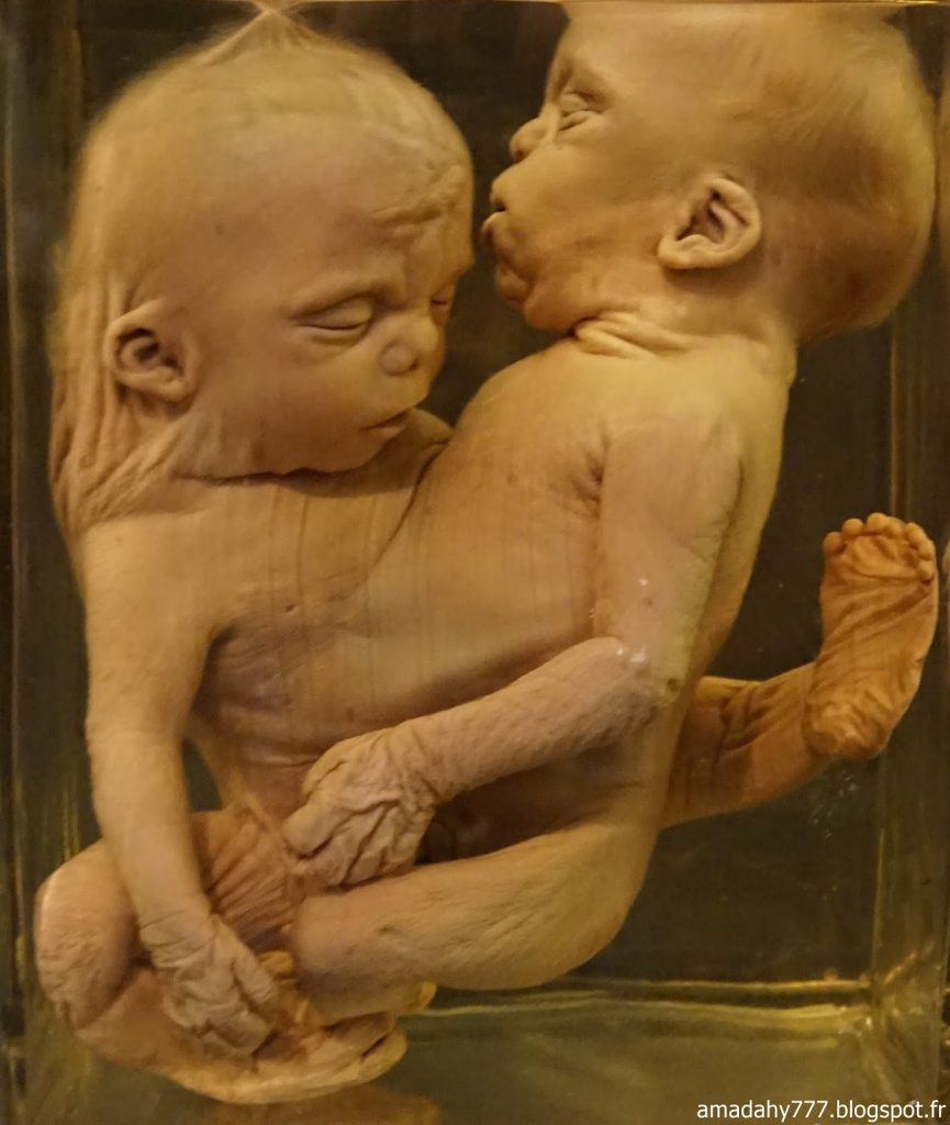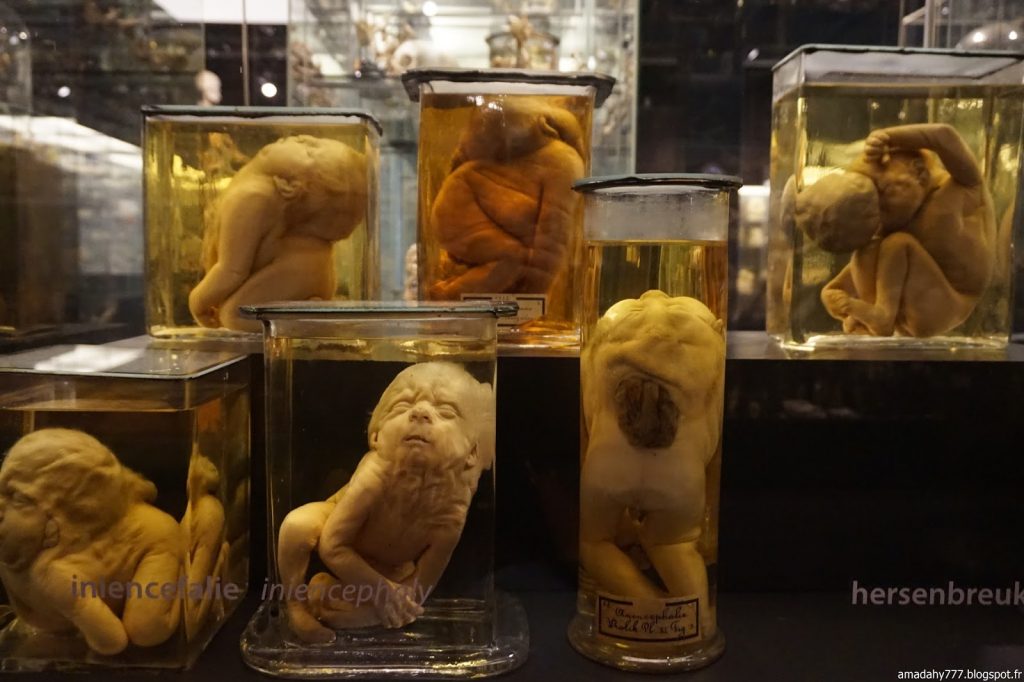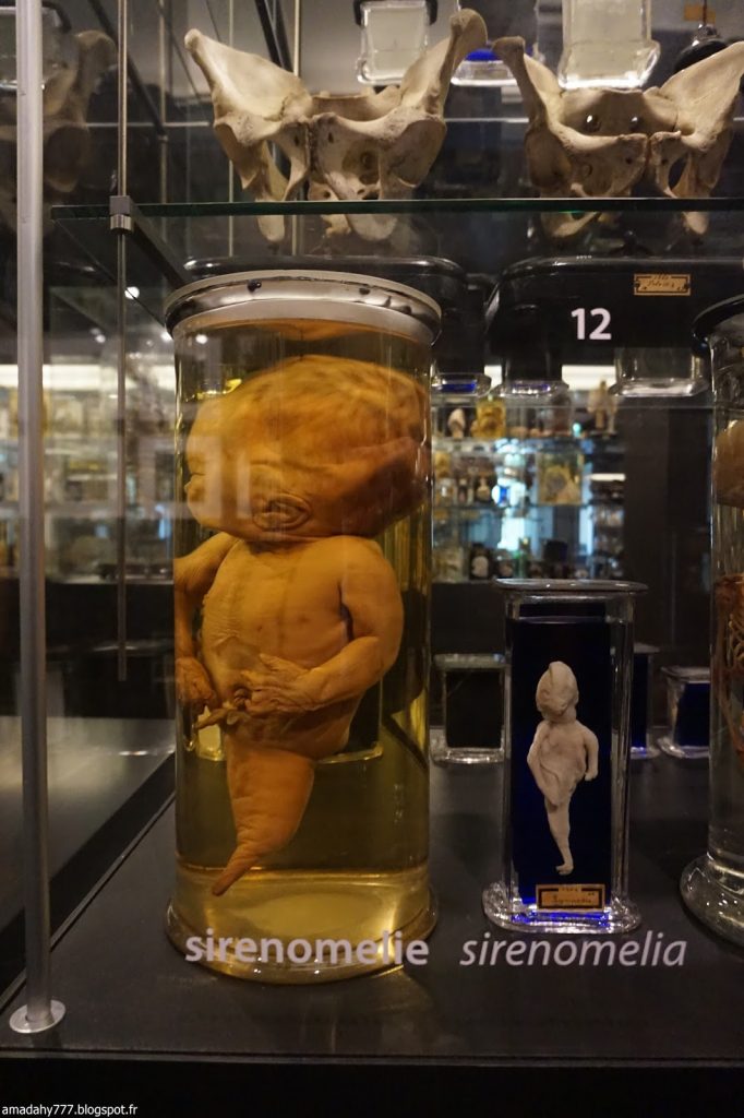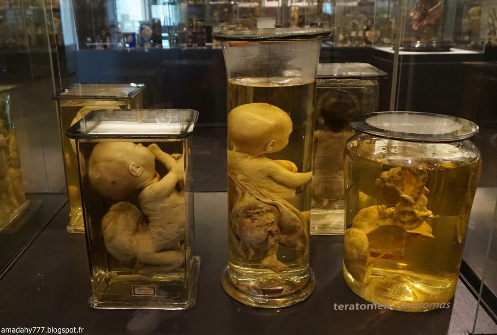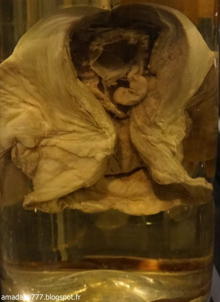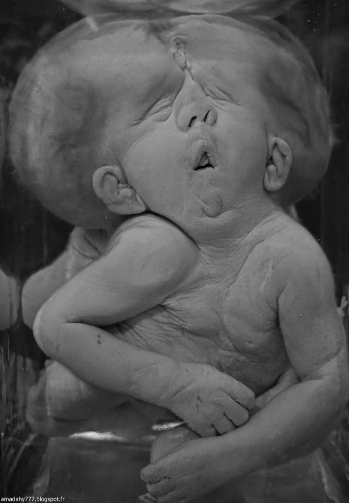 L'iniencéphalie est une malformation de l'arrière du crane / vertèbres, avec une absence de cou, dont l'origine est multifactorielle. "cyclopie", malformation génétique L'anencéphalie est une maladie congénitale qui cause une absence totale, ou en partie de cerveau, de crane. Joli petit dauphin Collection de scrotums Dans les petits pots : des calculs renaux bien énormes tétons L'ichtyose foetale, ou ichtyose harlequin ou encore "bébé collodion". La peau est brune, écailleuse, formant des croûtes. Très sèche, elle empêche les mouvements du bébé. La Sirénomélie, ou syndrome de la sirène, est une maladie fœtale où les membres inférieurs se forment de façon fusionnés. Anus et vulves pénis de foetus Pénis en coupe sagitale et en coupe transverse Défaut de la fermeture de la paroi thoracique Joli petit sternum Alien, la légende ? Celui de droite, on dirait un chat Le foetus macéré est un foetus mort in utéro qui a eu le temps de macérer et de se décomposer dans son liquide amniotique La grossesse molaire est due à un oeuf fertilisé qui présente une anomalie chromosomique fœtus papyracé est un fœtus mort in utero, aplati et desséché côtoyant un jumeau normal représentant une forme possible du syndrome transfuseur-transfusé