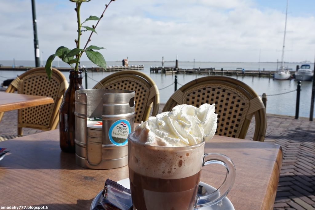 Volendam est un petit village côtier très, vraiment très touristique. Je déplore toutes ces boutiques souvenirs au nom d'amsterdam et cette horde de touristes, car les quais ne manquent pas de charme. Une fois n'est pas coutume, le froid et la fatigue faisant, un chocolat chaud chantilly pour reprendre des forces en fin de ballade !