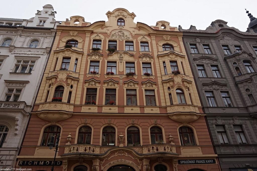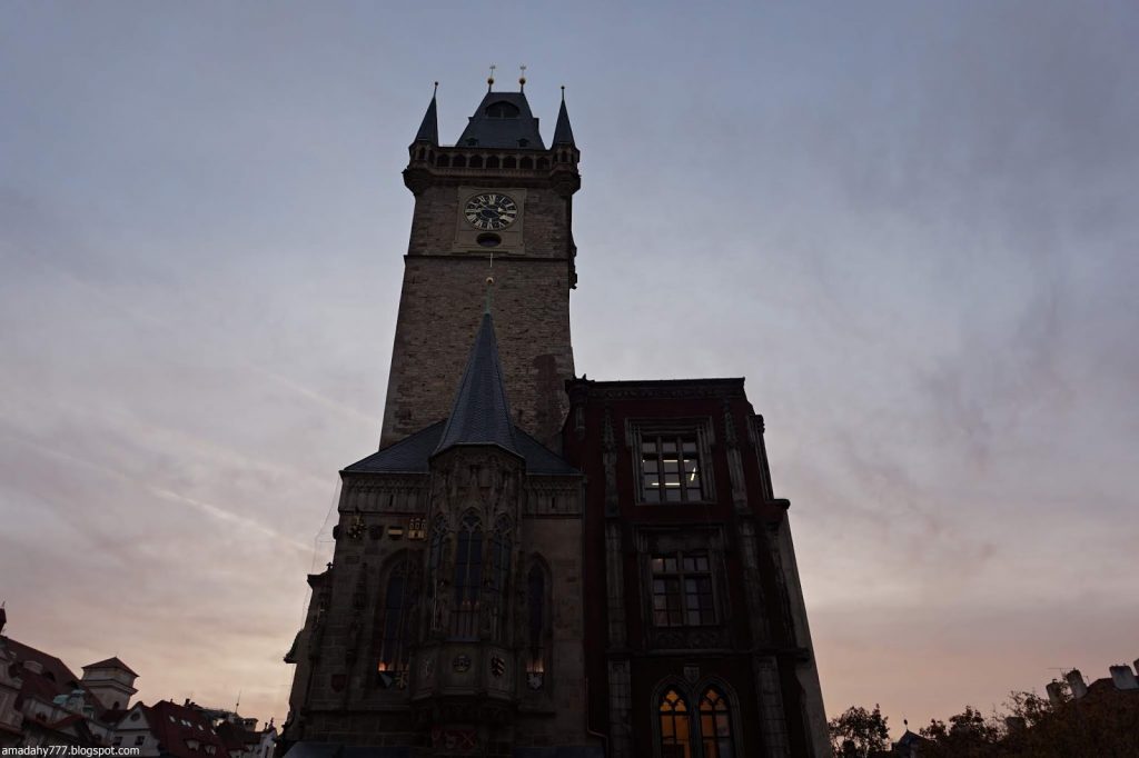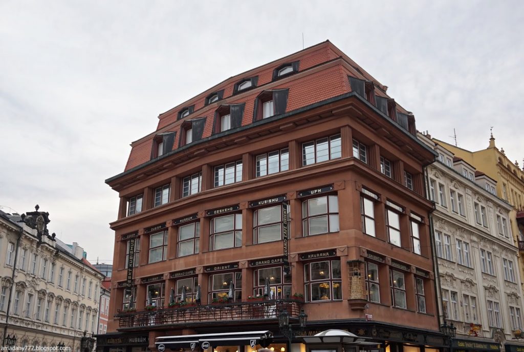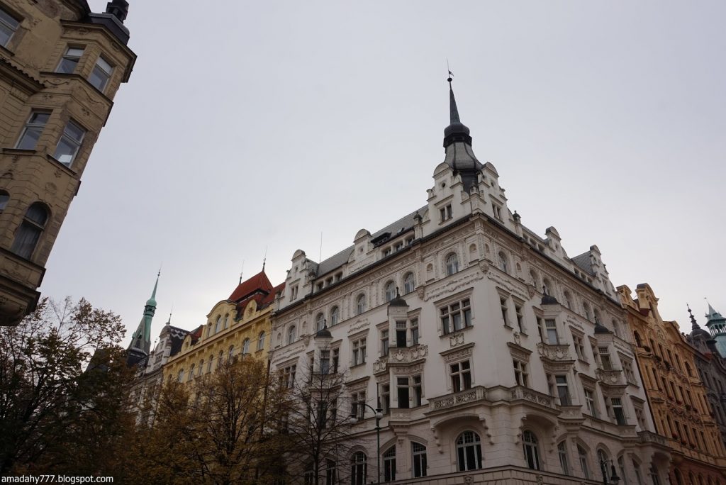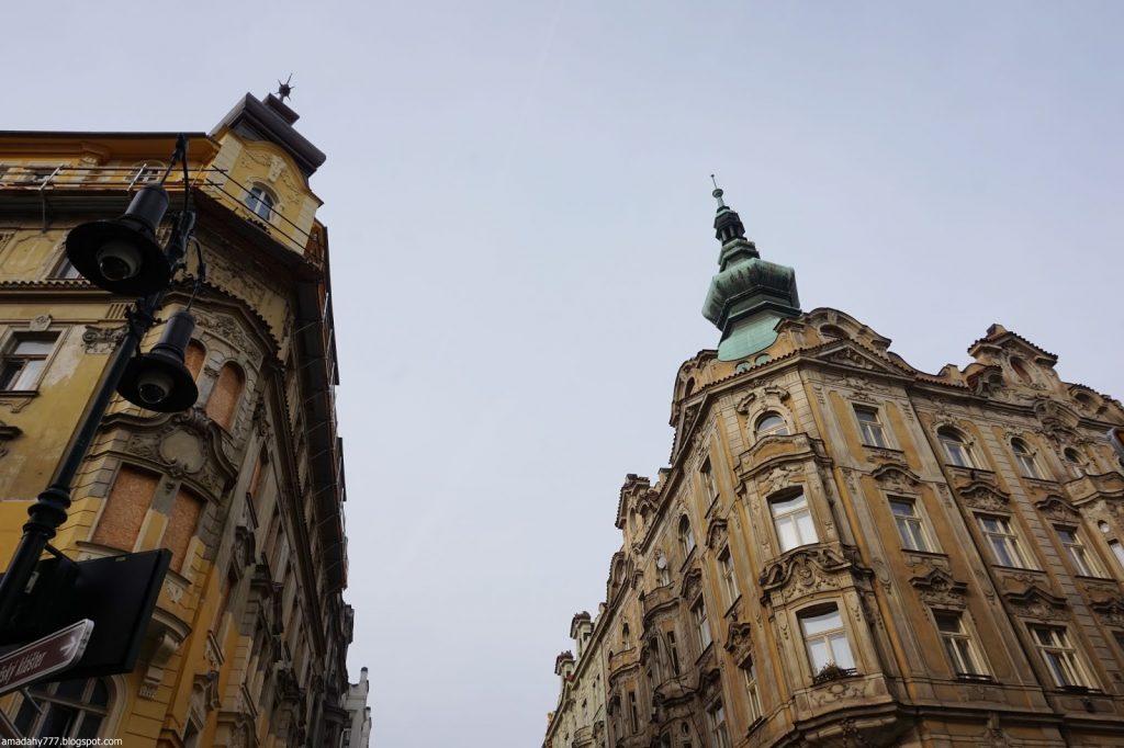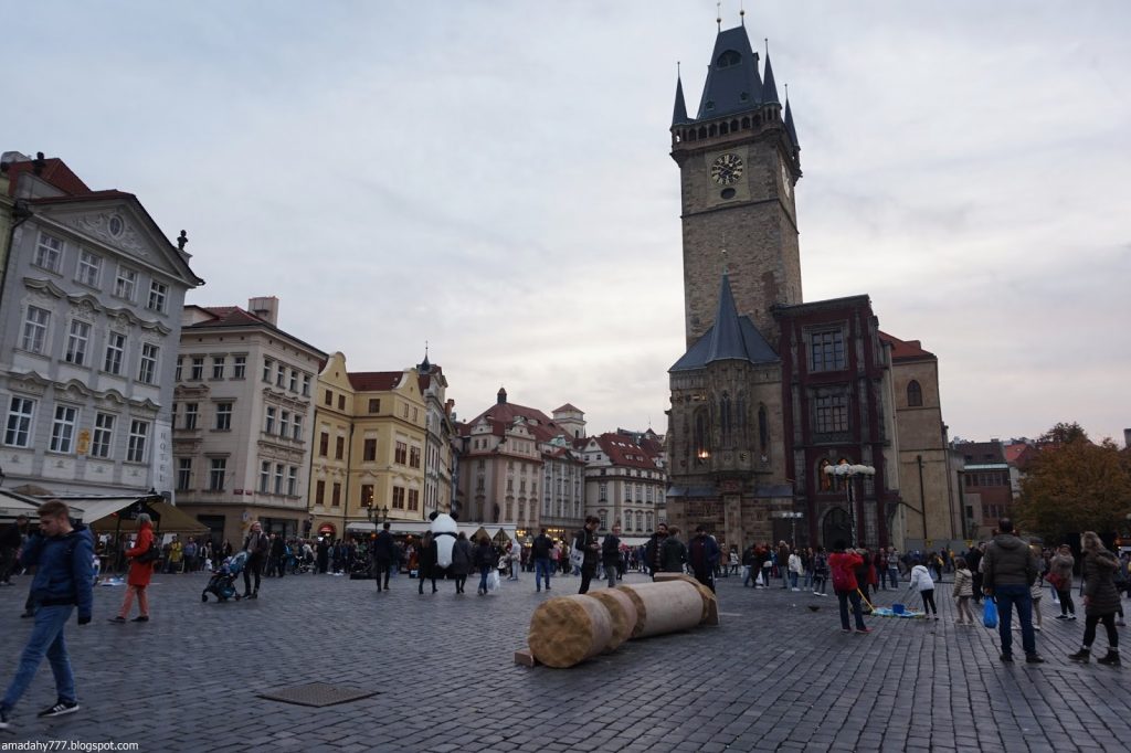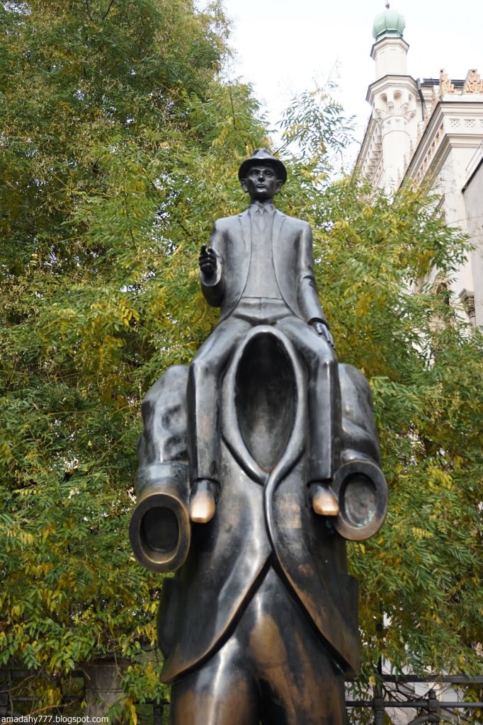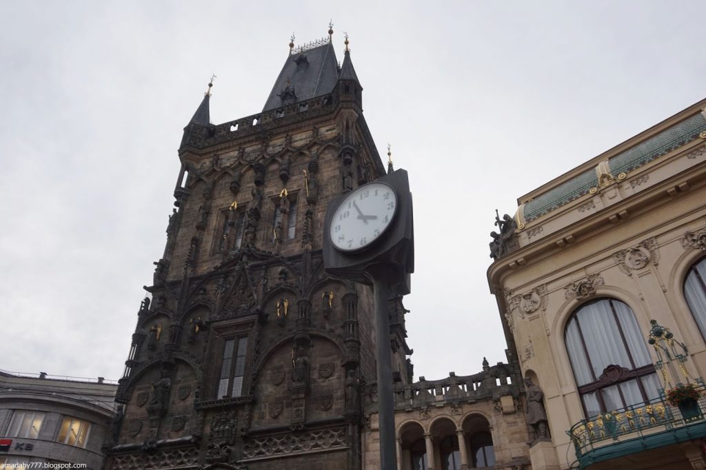 Kafka Tour de la Poudrière, collée au Musée MUCHA La tour de la vieille horloge, et ce "boudin" au sol, un obélisque détruit